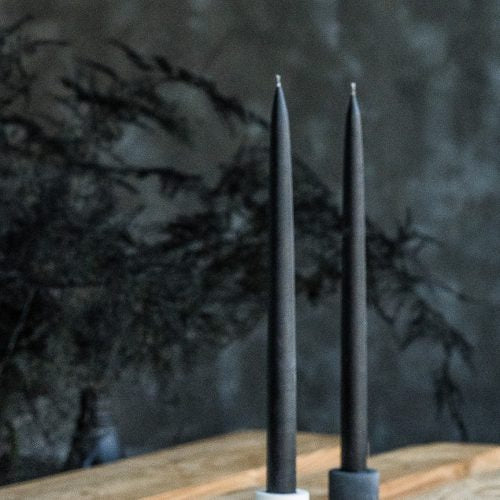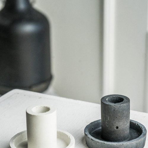 Minimalistinio stiliaus dizaino betono žvakidė tinkanti klasikinėms žvakėms. Klasikinės spalvos – juoda ir balta, puikia dera įvairiusiame interjere.