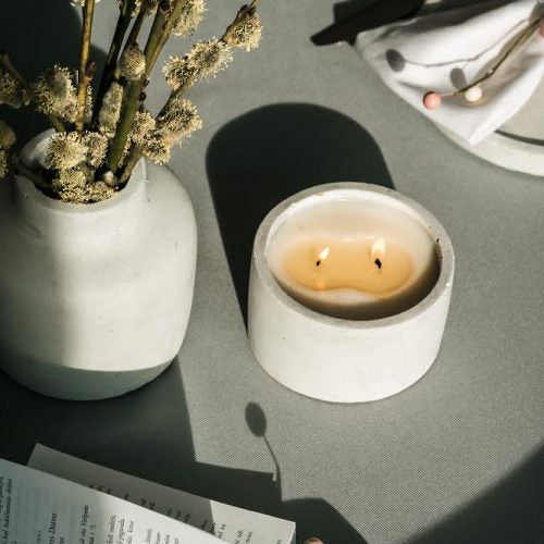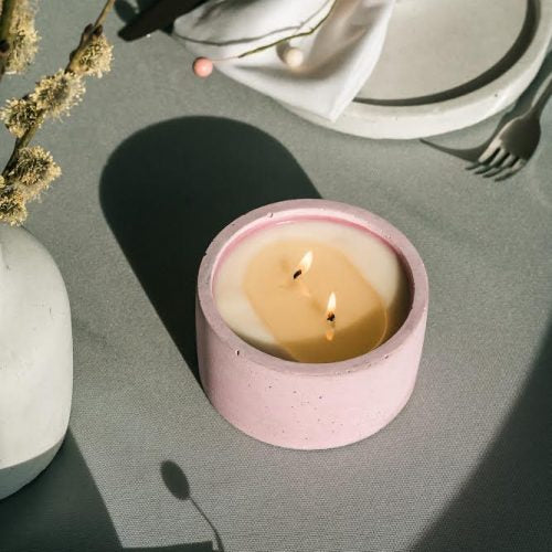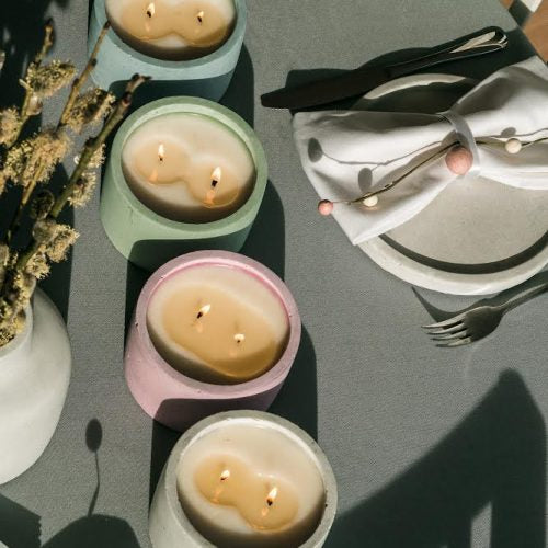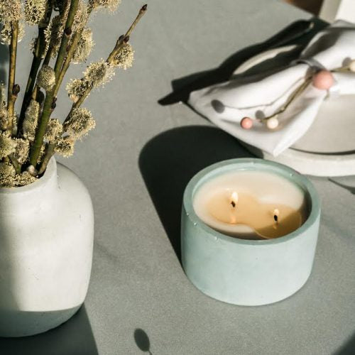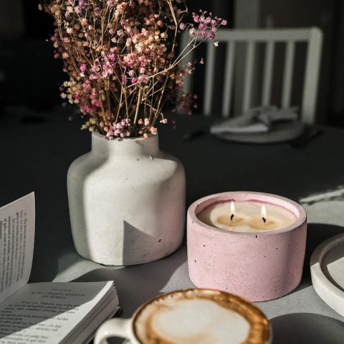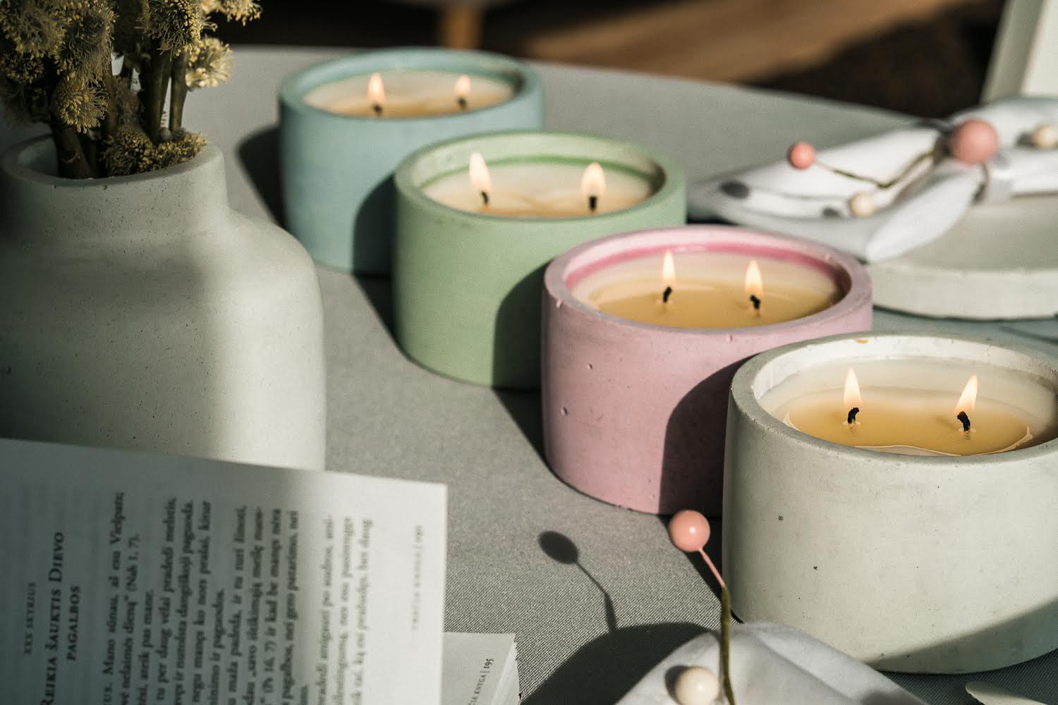 Štai ir įsitaisė sojų vaškas, pastelinio betono induose, kad neštų namams jaukumą, gaivą ir pavasarį. Jūsų teismui atiduodu:
