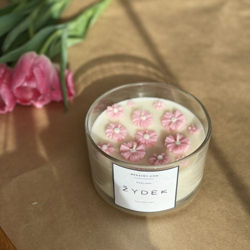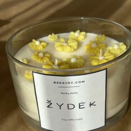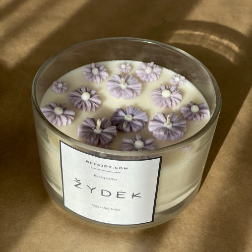 Žvakė didelė: 3 knatai, 0.5 kg vaško. Žvakės aukštis 7.6cm, skersmuo beveik 13cm